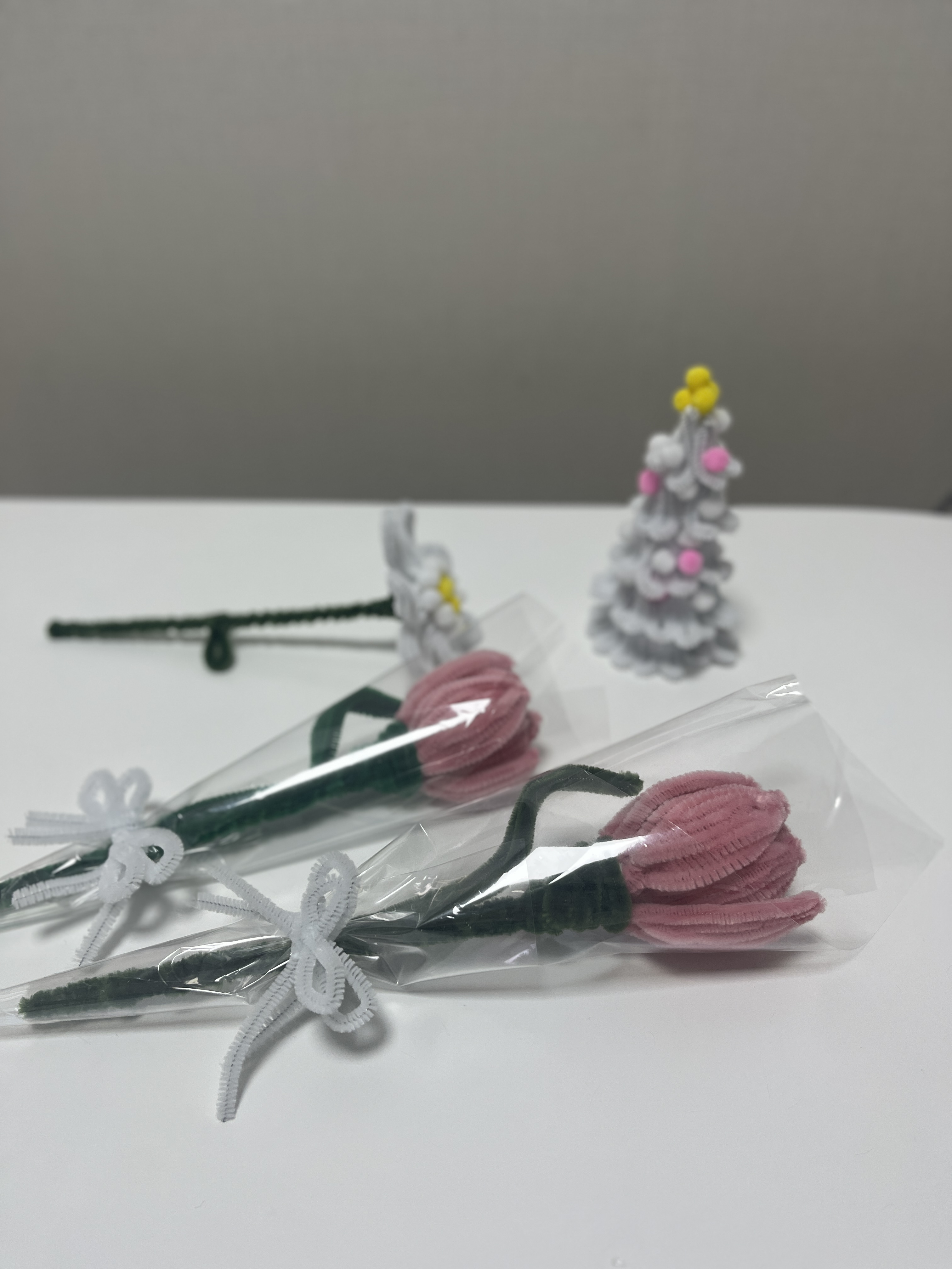 다이소에 파는 DIY 모루 꽃다발 만들기 제품으로 만들었다! 좀 허접하지만 꽤 귀엽지 않은가? 트리 만들기 설명서 종이를 둥글게 말아 테이프로 붙여주고, 밑부분을 잘라준다. 흰색 모루를 반으